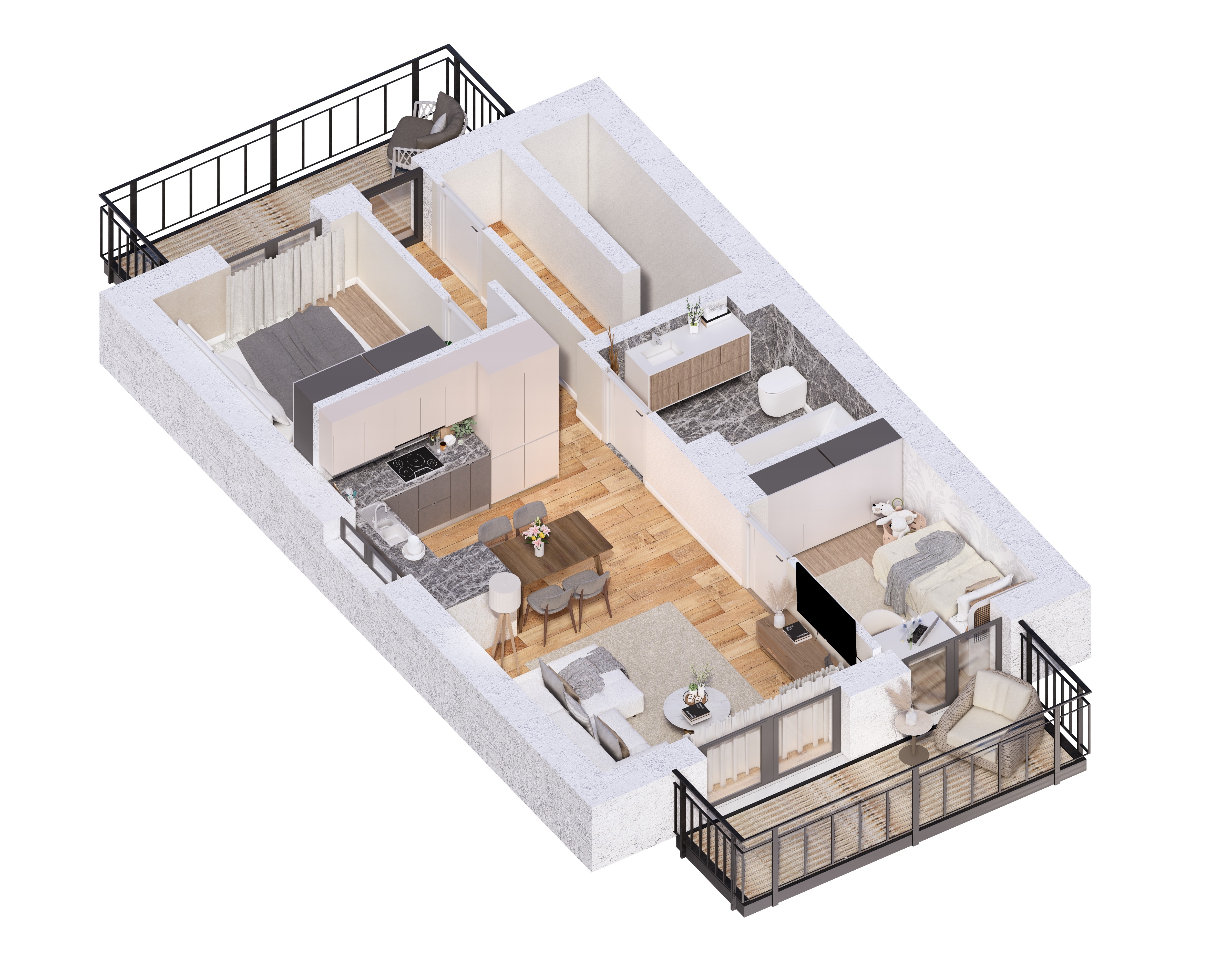 Rzuty 3D to doskonałe narzędzie do wizualizacji układu funkcjonalnego wnętrz, pomagające w procesie sprzedaży nieruchomości oraz planowaniu przestrzeni.